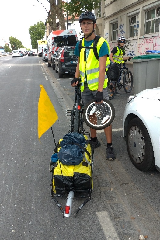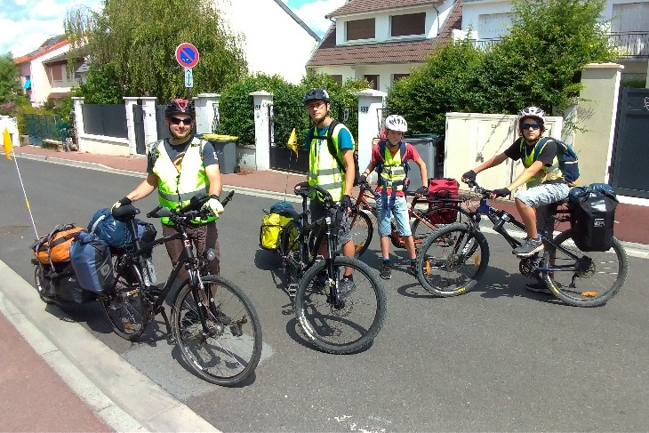 La fine équipe est prête. Moi 38kg de remorque, 25kg de velo, Yo 25kg de remorque, Cy et Ju je ne sais pas.