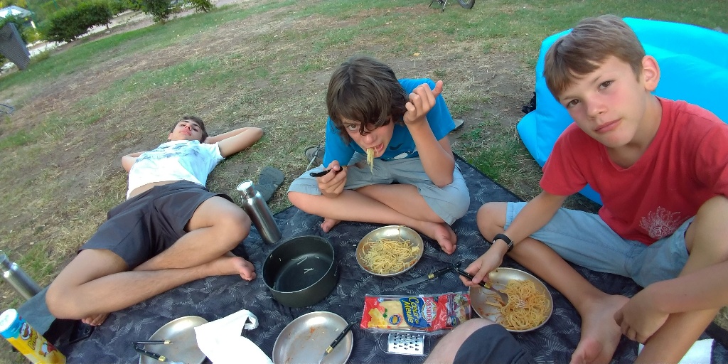 Arrivés au camping fatigués, affamés (une pastèque et deux paquets de gâteaux) j'ai décidé de les achever en les envoyant à la piscine.